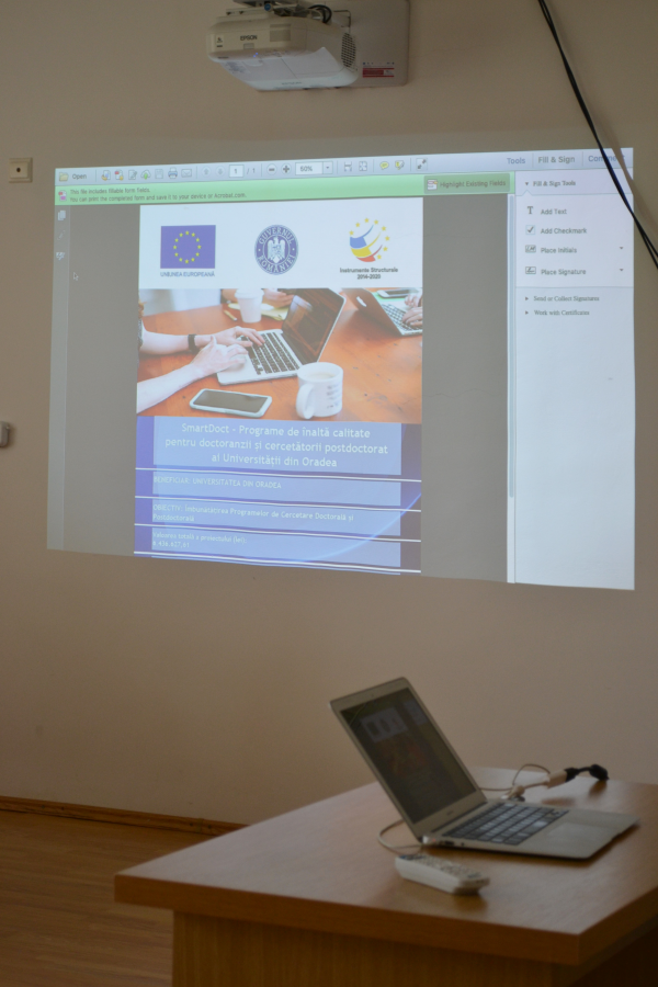 Managerul proiectului –Adrian Hatos a prezentat activitățile și rezultatele aşteptate în urma implementării proiectului, insistând asupra complexității proiectului care vizează, în special, formarea competențelor antreprenoriale și transversale ale studenților doctoranzi și postdoctoranzi, dar cuprinde și o componentă de încurajare a parteneriatului dintre universitate și agenţii economici relevanţi în legătură cu tema studiilor doctorale, precum și o componentă de cercetare a obstacolelor întâmpinate de doctoranzii Universității din Oradea în integrarea lor pe piața muncii. În cadrul acestei ultime componente, vor fi intervievați 30 de doctori ai Universității din Oradea și 30 de angajatori și vor fi organizate workshopuri pe următoarele teme: Cercetare, dezvoltare, inovare și antreprenoriat; Inovare socială și cercetarea universitară; Îmbunătăţirea accesibilităţii, a utilizării şi a calităţii tehnologiilor informaţiei şi comunicaţiilor în cercetarea științifică; Combaterea discriminării în viața academică; Promovarea dezvoltării durabile în învățământul superior și cercetarea academică; Tinerii cercetători pe piața muncii.